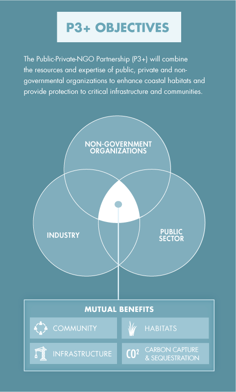 The Partnership for Our Working Coast initiative is built upon the foundation of strong Public-Private-NGO Partnership (P3+) that combines the resources and expertise of public, private, and non-governmental organizations to enhance coastal habitats and provide protection to critical infrastructure and communities.